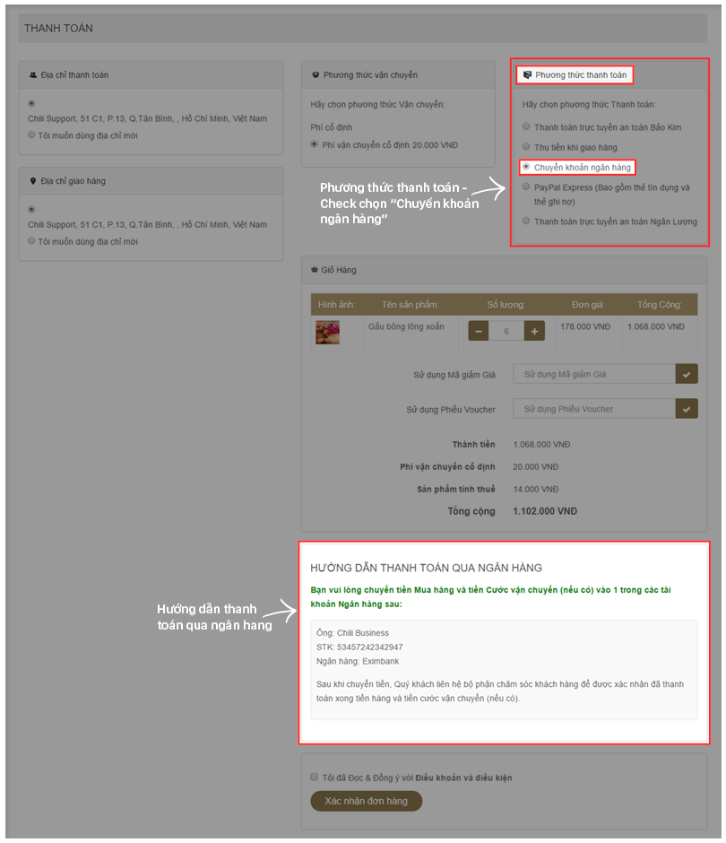 Khi nhấn chọn phương thức thanh toán này, quý khách vui lòng xem thông tin tài khoản ngân hàng bên dưới vài thực hiện giao dịch tại ngân hàng. Ví dụ vị trí tài khoản ngân hàng và thực hiện giao dịch tại ngân hàng.